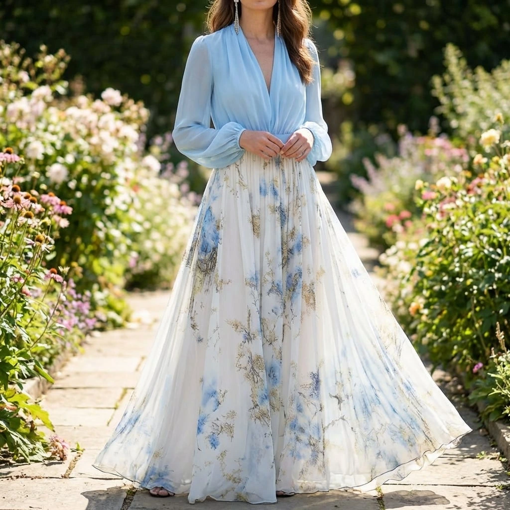 Women’s floral maxi dress with long sleeves and flowing skirt, designed for weddings, events, and elegant seasonal occasions.